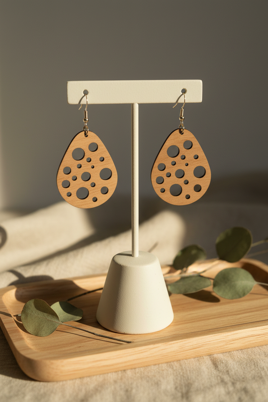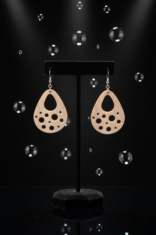 Bubble Cutout Teardrop Earrings — Laser‑Cut Walnut Veneer, Lightweight Modern Design