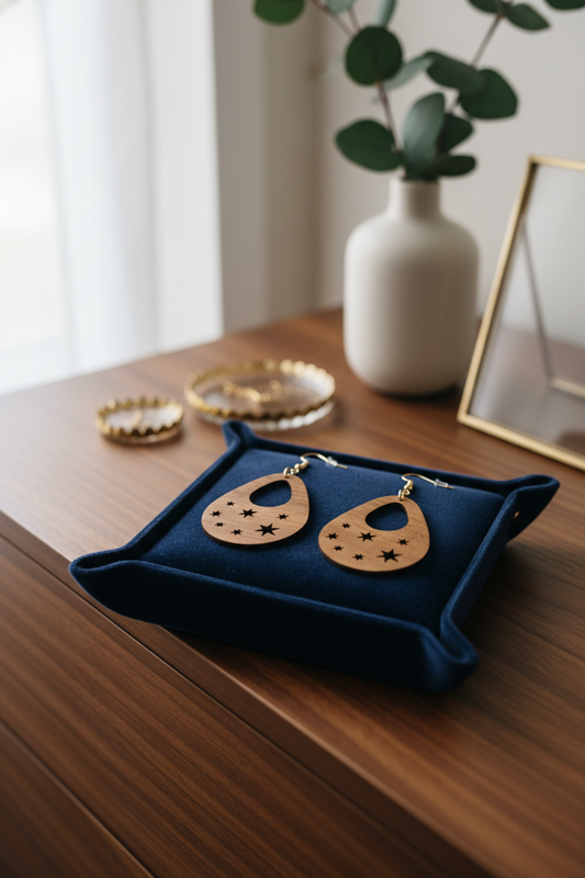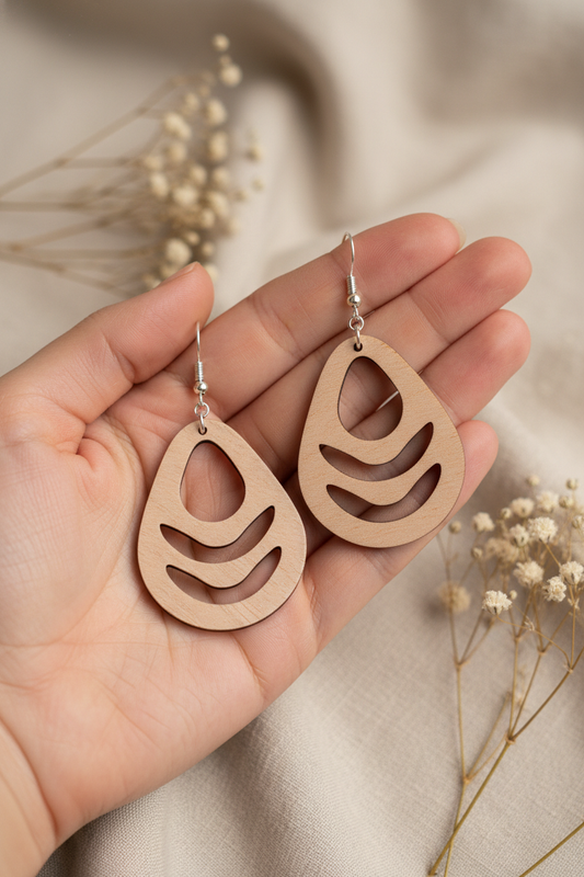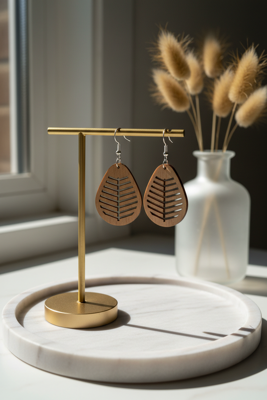 Refined geometric forms, crafted with precision. Our laser‑cut wooden earrings pair considered...