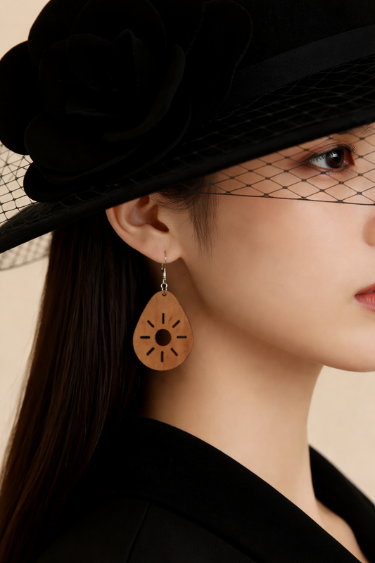 Sunburst Teardrop Earrings — Laser‑Cut Walnut Veneer, Lightweight Nature‑Inspired Design