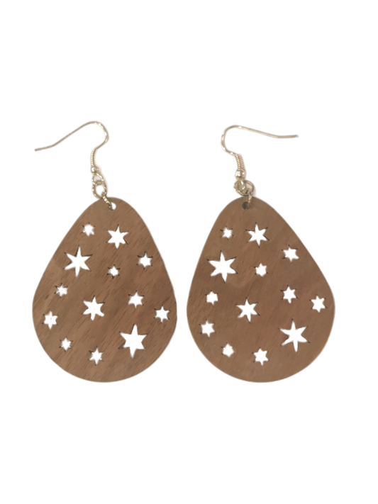 Star‑Cut Teardrop Earrings — Open‑Centre Walnut Veneer with Celestial Laser‑Cut Details