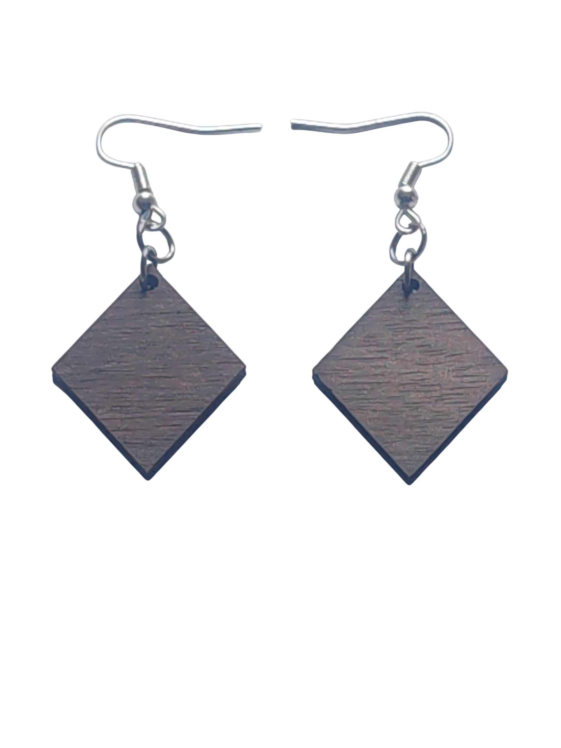 These walnut veneer earrings feature a simple diamond shape, offering a strong geometric silhouette with a clean, modern feel. The sharp angles and balanced proportions highlight the natural texture of the wood, creating a refined yet understated design.