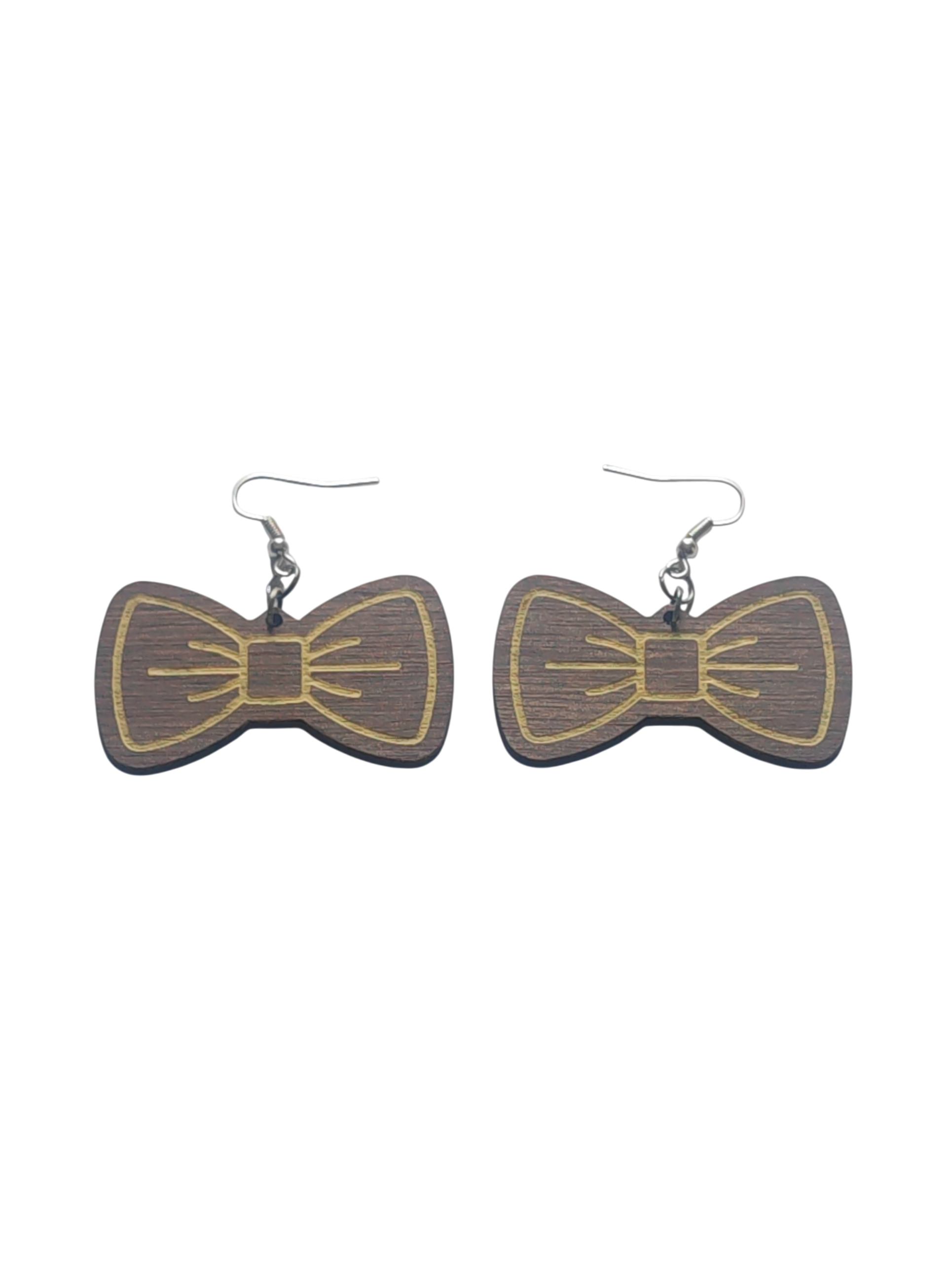 These bow‑shaped walnut veneer earrings feature fine engraved detailing that adds depth and subtle contrast to the clean, symmetrical form. Inspired by classic bow and bow‑tie shapes, the design balances playful character with a refined, handcrafted finish.