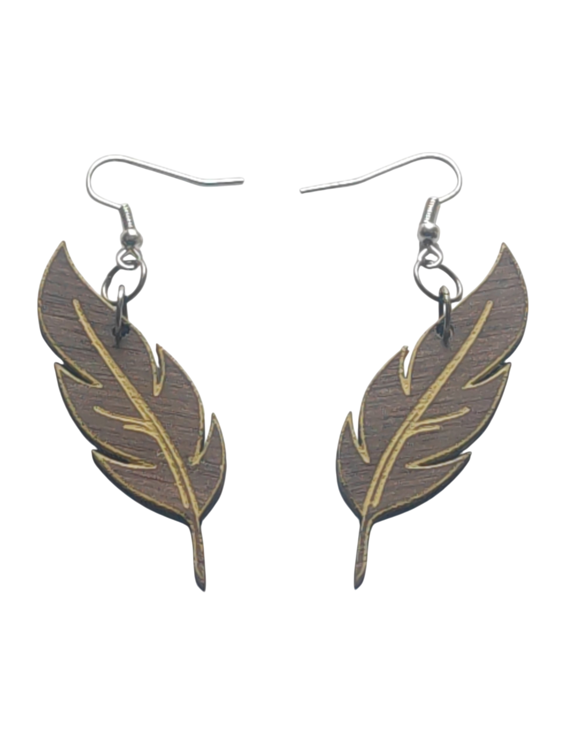 Walnut Veneer Earrings – Engraved Feather Wooden Dangles